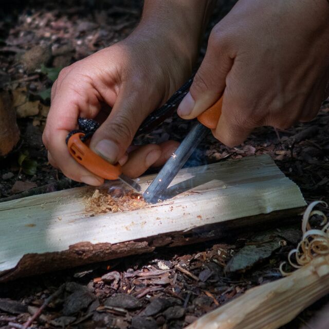 Ein Set mit Feuerstahl und Kienspan kann vor Ort gekauft oder während des Kurses kostenlos genutzt werden.